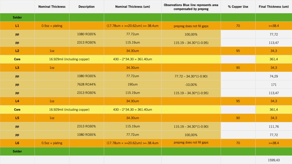 At this point, calculations must be adjusted. For this, the datasheets of the prepreg and core manufacturers are needed, as well as details of the etched circuit, specifically: