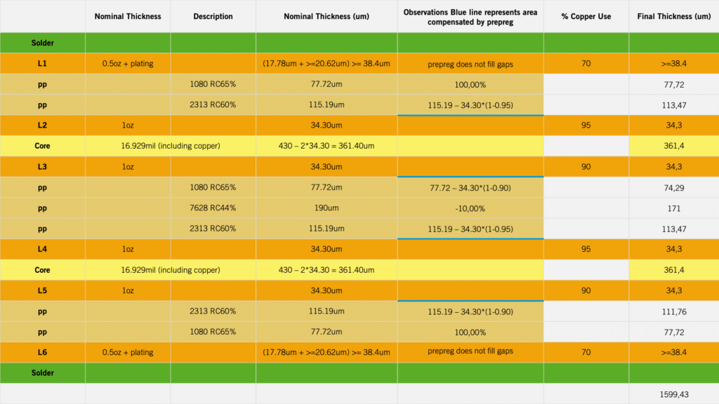 - Wie viel Kupfer in jeder geätzten Lage verbleibt – also der Prozentsatz des Kupfers nach dem Ätzen. Der entfernte Kupferanteil entspricht dem Volumen, das das benachbarte Prepreg beim Schmelzen des Harzes ausfüllt.