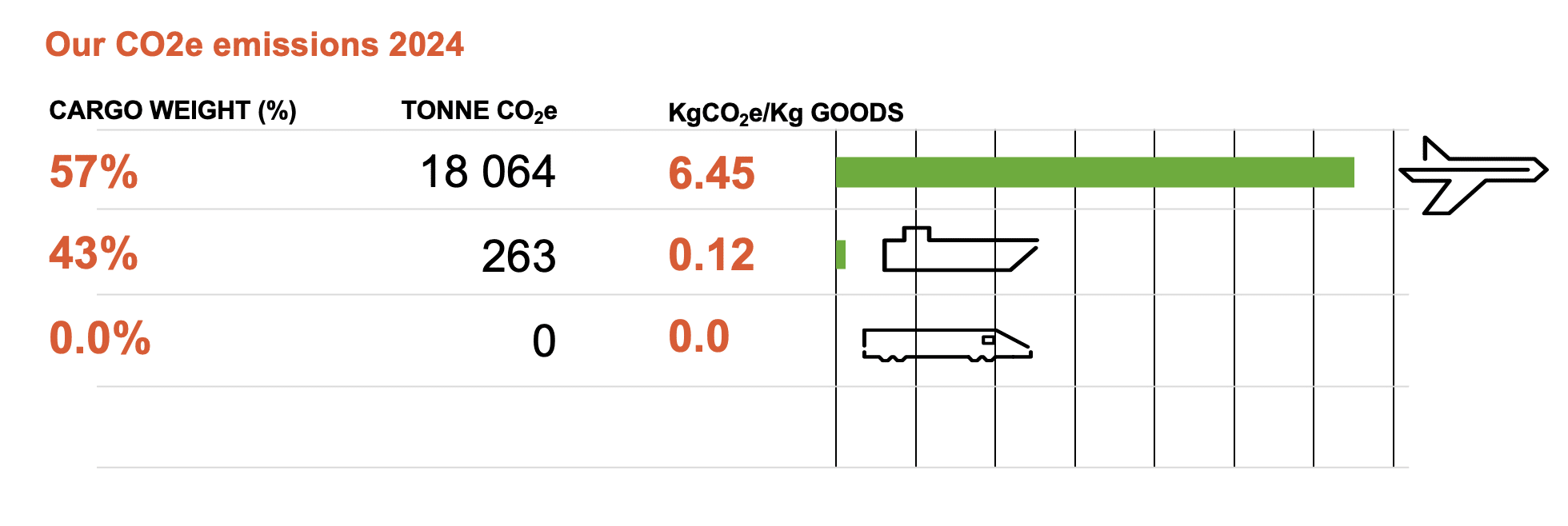 Im Jahr 2022 lagen unsere durchschnittlichen Treibhausgasemissionen (gemessen in CO2-Äquivalenten) bei folgenden Werten: Luft 6,45 kg CO2e/kg Ware, See 0,12 kg CO2e/kg Ware und Schiene 0,0 kg CO2e/kg Ware. Die Wahl des See- oder Bahntransports anstelle des Lufttransports hat einen großen Einfluss auf die Verringerung der Emissionen.