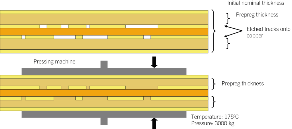 This is where prepreg thickness reduction occurs, often surprising designers: the resin flows into the gaps left in the copper layers after etching the traces. This reduction is usually not considered when planning nominal layer thickness.