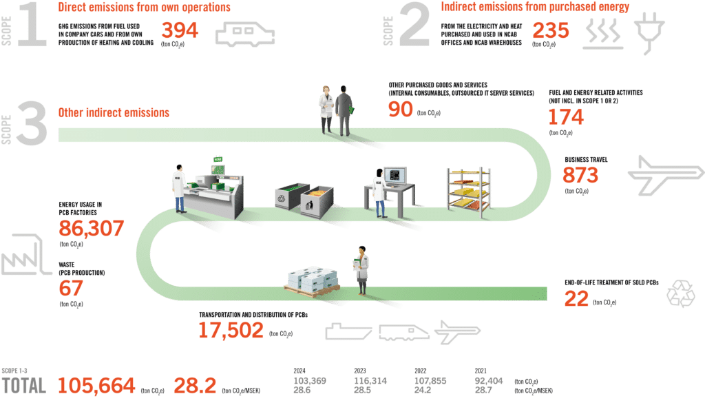 Our biggest impact is in our scope 3; emissions from energy consumption in PCB production (Category 1: Purchased goods and services) and from transportation (Category 4. Upstream transportation and distribution).